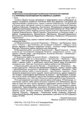 Телеграмма командующего войсками Тюменской губернии Г.А. Буриченко помглавкому по Сибири В.И. Шорину. г. Ишим. 21 мая 1921 г.