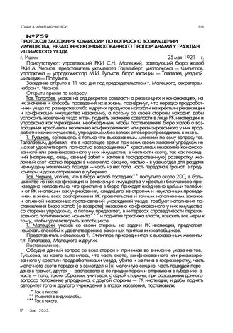 Протокол заседания комиссии по вопросу о возвращении имущества, незаконно конфискованного продорганами у граждан Ишимского уезда. г. Ишим. 25 мая 1921 г.
