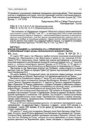 Доклад командира 3-го батальона 674-го стрелкового полка в оперативным отдел штаба Приуральского военного округа. 30 мая 1921 г. // РГВА. Ф. 25892. Оп. 3. Д. 71. Лл. 275, 276. Машинописная копия.