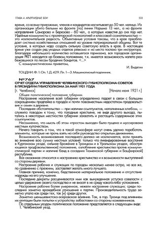 Отчет отдела управления Челябинского губисполкома советов в президиум губисполкома за май 1921 года. [г. Челябинск]. Начало июня 1921 г. // ЦДНИЧО. Ф. 596. Оп. 1. Д. 197. Л. 188. Машинописная копия.
