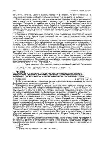 Из доклада руководства Ялуторовского уездного исполкома советов о политическом и экономическом положении уезда. г. Ялуторовск. 3 августа 1921 г. // ГАТО. Ф. р. 2. Оп. 2. Д. 12. Лл. 68-71. Машинописный подлинник.