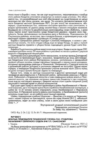Доклад председателя Тюменской губчека П.И. Студитова начальнику секретного отдела ВЧК Т.П. Самсонову. г. Тюмень. Не ранее 5 августа 1921 г. // ТОЦДНИ. Ф. 1. Оп. 1. Д. 279. Лл. 122-124. Машинописный отпуск.