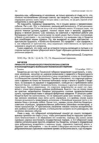 Приказ № 20 Тюменского губисполкома советов и командующего войсками Тюменской губернии. г. Тюмень. 15 октября 1921 г. // ГАТО. Ф. р. 2. Оп. 1. Д. 152. Лл. 128, 129. Машинописный подлинник. Опубликовано: Трудовой набат. Тюмень. 26 октября 1921 г.