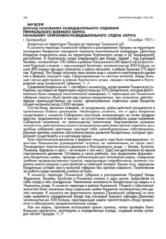Доклад начальника разведывательного отделения Приуральского военного округа начальнику оперативно-разведывательного отдела округа. г. Екатеринбург. 15 ноября 1921 г. // РГВА. Ф. 25892. Оп. 3. Д. 125. Лл. 108, 109. Машинописный подлинник.