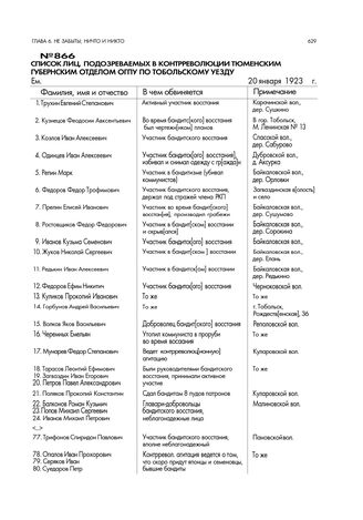 Список лиц, подозреваемых в контрреволюции Тюменским губернским отделом ОГПУ по Тобольскому уезду. 20 января 1923 г. // ТОЦДНИ. Ф. 3894. Оп. 1. Д. 34. Лл. 8, 9. Машинописный подлинник.