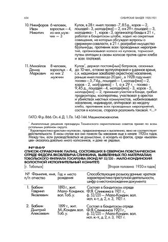Список-справочник лиц, состоявших в северном повстанческом отряде Федора Яковлевича Слинкина, выявленных по материалам Тобольского филиала госархива (фонд № 52/220 - Мало-Кондинский волостной исполнительный комитет). [Вторая половина 1930-х годов] // ТФ ГАТО. Ф. р. 402. Оп. 3. Д. 253. Лл. 1-7. Машинописный подлинник.