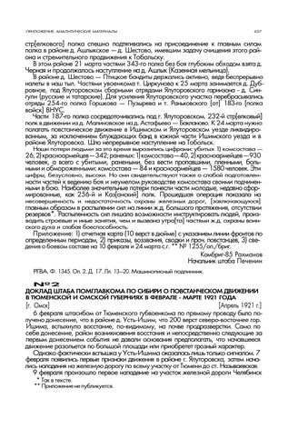 Доклад штаба помглавкома по Сибири о повстанческом движении в Тюменской и Омской губерниях в феврале - марте 1921 года. [г. Омск] Апрель 1921 г.