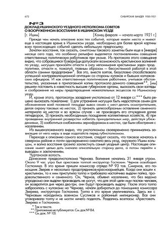 Доклад Ишимского уездного исполкома советов о вооруженном восстании в Ишимском уезде. [г. Ишим]. Конец февраля — начало марта 1921 г. // ГАТО. Ф. р. 2. Оп. 1. Д. 231. Лл. 16—26. Машинописный подлинник.