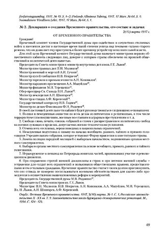 Декларация о создании Временного правительства, его составе и задачах. 2(15) марта 1917 г. // Опубл.: Вестник Временного правительства. 1917, 5(18) марта. № 1. С. 1: Российское законодательство X-XX вв. Т. 9. Законодательство эпохи буржуазно-демократических революции. М., 1994. С. 124-125.