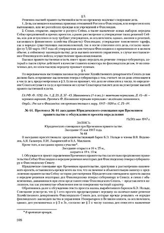 Протокол № 44 заседания Юридического совещания при Временном правительстве с обсуждением проекта определения. 15(28) мая 1917 г. // ГА РФ. Ф. 1792. Оп. 1. Д. 2. Л. 186-188. Машинопись: Д. 29. Л. 85-36 об. Типографский текст. Опубл.: Россия и Финляндия: от противостояния к миру. 1917-1920 гг. С. 81-84 (частично): Записи хода заседаний Юридического совещания при Временном правительстве. Т. 1. С. 268-276 (полностью).