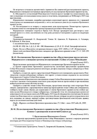 Постановление Временного правительства «Представленные председателем Юридического совещания проекты постановлений о Сейме и Сенате Финляндии». 20 мая (2 июня) 1917 г. // Опубл.: Журналы заседаний Временного правительства. Т. 2. Май-июнь 1917 года. М., 2002. С. 88.