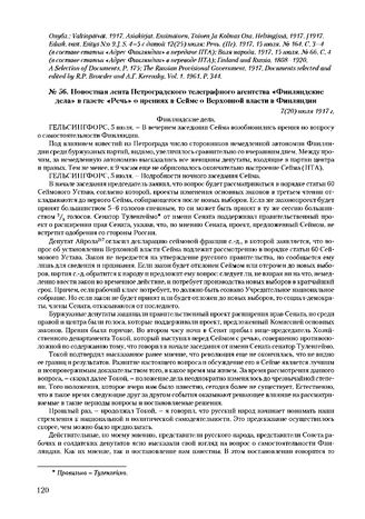 Новостная лента Петроградского телеграфного агентства «Финляндские дела» в газете «Речь» о прениях в Сейме о Верховной власти в Финляндии. 7(20) июля 1917 г. // Опубл.: Речь. (Пг.). 1917, 7(20) июля. № 157. С. 5.