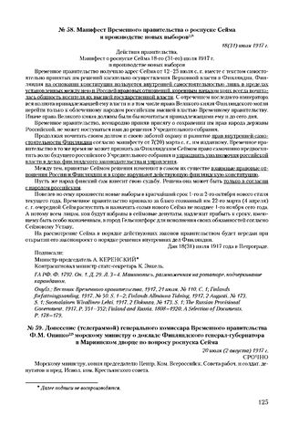 Донесение (телеграммой) генерального комиссара Временного правительства Ф.М. Онипко морскому министру о докладе Финляндского генерал-губернатора в Мариинском дворце по вопросу роспуска Сейма. 20 июля (2 августа) 1917 г. // ГА РФ. Ф. 1778. Оп. 1. Д. 246. Л. 60. Машинопись.