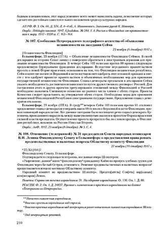 Отношение (телеграммой) № 31 председателя Совета народных комиссаров В.И. Ленина Финляндскому Сенату в Гельсингфорс о предоставлении права решать продовольственные и валютные вопросы Областному комитету Финляндии. 27 ноября (10 декабря) 1917 г.
