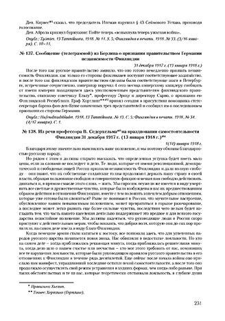 Сообщение (телеграммой) из Берлина о признании правительством Германии независимости Финляндии. 31 декабря 1917 г. (13 января 1918 г.) // Опубл.: Hufvudstadsbladet. 1918,13 Tammikuuta. № 13. С. 5; Финляндия в печати. 1918. № 34. (4/17 января). С. 1.