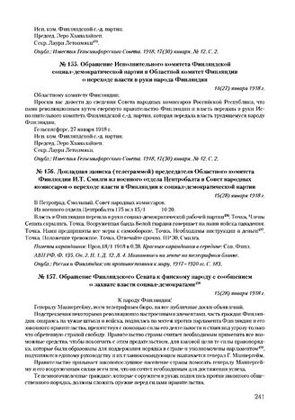 Докладная записка (телеграммой) председателя Областного комитета Финляндии И.Т. Смилги из военного отдела Центробалта в Совет народных комиссаров о переходе власти в Финляндии к социал-демократической партии. 15(28) января 1918 г. // АВП РФ. Ф. 135. Оп. 2. П. 1. Д. 12. Л. 4. Машинопись. Опубл.: Россия и Финляндия: от противостояния к миру. 1917-1920 гг. С. 183.