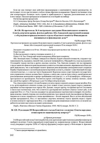 Из протокола № 8 экстренного заседания Исполнительного комитета Совета депутатов армии, флота и рабочих Або-Аландской укрепленной позиции с обсуждением приказа военного отдела областного комитета Финляндии не вмешиваться в финляндские дела. 15(28)...