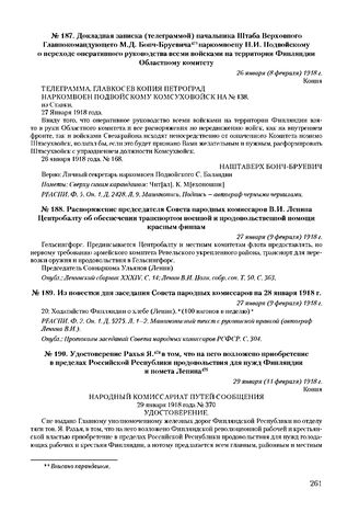 Докладная записка (телеграммой) начальника Штаба Верховного Главнокомандующего М.Д. Бонч-Бруевича наркомвоену Н.И. Подвойскому о переходе оперативного руководства всеми войсками на территории Финляндии Областному комитету. 26 января (8 февраля) 1918 г. // РГАСПИ. Ф. 5. Оп. 1. Д. 2428. Л. 9. Машинопись.