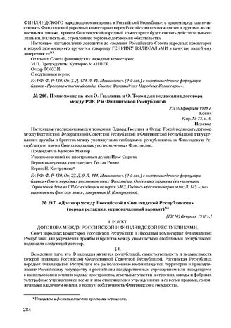 Полномочие на имя Э. Гюллинга и О. Токоя для подписания договора между РФСР и Финляндской Республикой. 23(10) февраля 1918 г. // ГА РФ. Ф. Р-130. Оп. 23. Д. 9. Л. 144. Машинопись (2-й экз.); Л. 145 - машинопись на финском языке.