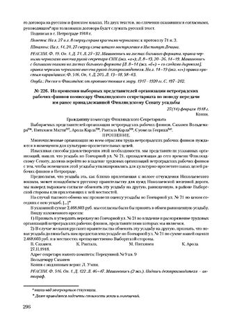 Из прошения выборных представителей организации петроградских рабочих-финнов комиссару Финляндского секретариата по поводу передачи им ранее принадлежавшей Финляндскому Сенату усадьбы. 27(14) февраля 1918 г. // РГАСПИ. Ф. 516. Оп. 1. Д. 122. Л. 46-47. Машинопись.