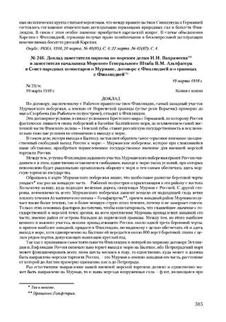 Доклад заместителя наркома по морским делам И.И. Вахрамеева и заместителя начальника Морского Генерального Штаба В.М. Алыфагера в Совет народных комиссаров о Мурмане, договоре с Финляндией и о границах с Финляндией. 19 марта 1918 г.