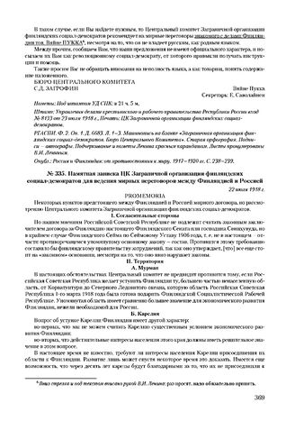 Памятная записка ЦК Заграничной организации финляндских социал-демократов для ведения мирных переговоров между Финляндией и Россией. 22 июля 1918 г. // АП РФ. Ф. 3. Оп. 66. Д. 576. Л. 15-18. Машинопись. Опубл.: Россия и Финляндия: от противостояния к миру. 1917-1920 гг. С. 240-242.