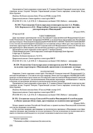 Соглашение между Советской Россией и Финляндией об освобождении и обмене граждан обеих стран, арестованных по политическим причинам. 29 июля 1918 г. // Опубл.: Северная коммуна. 1918, 31 июля. № 67. С. 2; ДВП. Т. 1. С. 412-414; Daily Review of the foreign Press (British). 1918, 1 August.