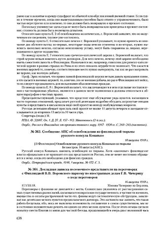 Докладная записка полномочного представителя на переговорах с Финляндией В.В. Воровского наркому по иностранным делам Г.В. Чичерину о ходе переговоров. 16 августа 1918 г. // РГВА. Ф. 33987. Оп. 1. Д. 27. Л. 187. Машинопись. Опубл.: Россия и Финляндия: от противостояния к миру. 1917-1920 гг. С. 289-270.