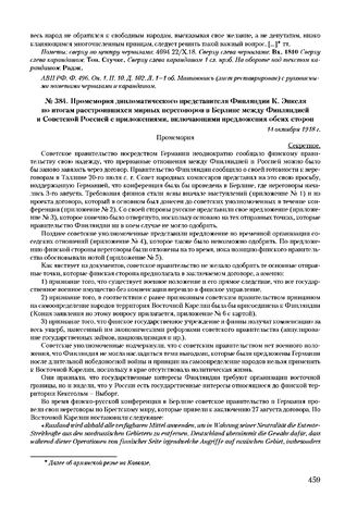 Промемория дипломатического представителя Финляндии К. Энкеля по итогам расстроившихся мирных переговоров в Берлине между Финляндией и Советской Россией с приложениями, включающими предложения обеих сторон. 14 октября 1918 г.
