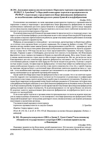 Докладная записка уполномоченного Наркомата торговли и промышленности РСФСР З. Гржебина в Народный комиссариат торговли и промышленности РСФСР о переговорах с представителем Бюро финляндских фабрикантов по возобновлению снабжения русского рынка бумагой и полуфабрикатами. Ноябрь 1918 г. // РГАЭ. Ф. 413. Оп. 2. Д. 67. Л. 174-174 об. Машинопись.