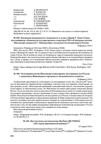 Докладная американского поверенного в делах в Данни У. Грэнт-Смита исполняющему обязанности государственного секретаря США об интервью регента Финляндии генерала К.Г. Маннергейма о возможности интервенции в Россию. 20 февраля 1919 г.