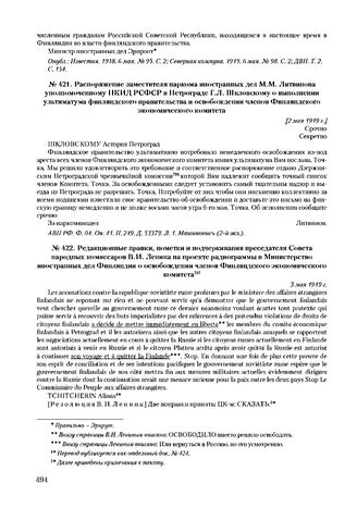 Распоряжение заместителя наркома иностранных дел М.М. Литвинова уполномоченному НКИД РСФСР в Петрограде Г.Л. Шкловскому о выполнении ультиматума финляндского правительства и освобождении членов Финляндского экономического комитета. [2 мая 1919 г.]