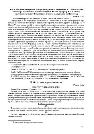 Из Конституции Финляндии. 17 июля 1919 г. // РГАСПИ. Ф. 5. Оп. 1. Д.2218. Л. 1-25. Машинопись. Незаверенная копия. Ф. 518. Оп. 2. Д. 385. Л. 26-27. Опубл.: Suomen Asetuskokoelma (finlands Гtirfattningssamling). 1919. № 94.