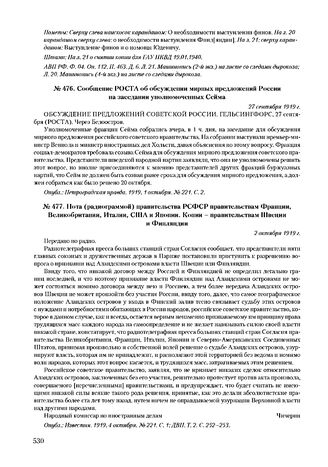 Сообщение РОСТА об обсуждении мирных предложении России на заседании уполномоченных Сейма. 27 сентября 1919 г. // Опубл.: Петроградская правда. 1919, 1 октября, № 221. С. 2.