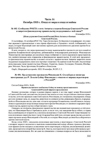 Представление президента Финляндии К. Стольберга и министра иностранных дел Р. Холсти Сейму Финляндии с отказом от мирных переговоров с Россией. 14 октября 1919 г.
