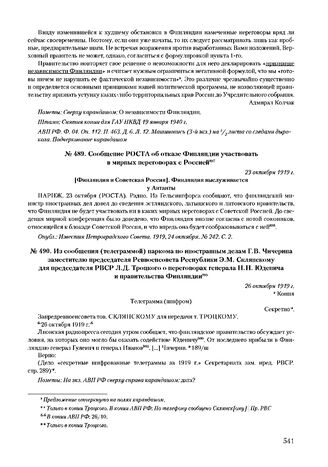 Сообщение РОСТА об отказе Финляндии участвовать в мирных переговорах с Россией. 23 октября 1919 г.