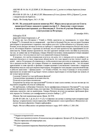 Из докладной записки министра М.С. Маргулиеса председателю Совета министров Северо-западного правительства С.Г. Лианозову о переговорах с министром иностранных дел Финляндии Р. Холсти об участии Финляндии в наступлении на Петроград. 27 октября 1919 г. // ГА РФ. Ф. 0385. Оп. 1. Д. 24. Л. 9-11. Л. 2-8. Рукопись. Опубл.: Россия и Финляндия: от противостояния к миру. 1917-1920 гг. С. 295-290.