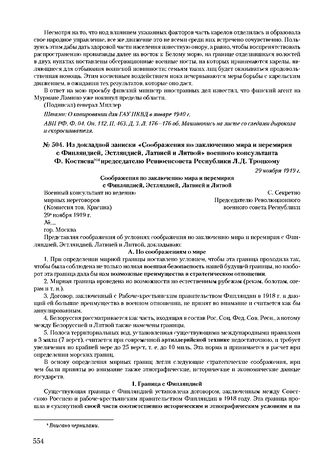 Из докладной записки «Соображения по заключению мира и перемирия с Финляндией, Эстляндией, Латвией и Литвой» военного консультанта Ф. Костяева председателю Реввоенсовета Республики Л.Д. Троцкому. 29 ноября 1919 г.