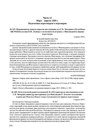 Инициативная записка наркома иностранных дел Г.В. Чичерина в Политбюро ЦК РКП(б) (копия В.И. Ленину) о возможности вступить с Финляндией в мирные переговоры. 1 марта 1920 г. // АВП РФ. Ф. 04. Оп. 41. П. 249. Д. 53382. Л. 2-2 об. Машинопись (3-й зкз); Л. 3. Копия. Машинопись (1 экз.). Опубл.: Россия и Финляндия: от противостояния к миру. 1917-1920 гг. С. 301.