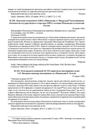Нота (радиотелеграммой № 757) наркома по иностранным делам Г.В. Чичерина министру иностранных дел Финляндии Р. Холсти. 21 марта 1920 г. // Опубл.: Известия. 1920 г., 24 марта. № 64. С. 2; ДВП. Т. 2. С. 414.