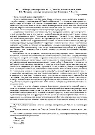 Нота (радиотелеграммой № 774) наркома по иностранным делам Г.В. Чичерина министру иностранных дел Финляндии Р. Холсти. 22 марта 1920 г.