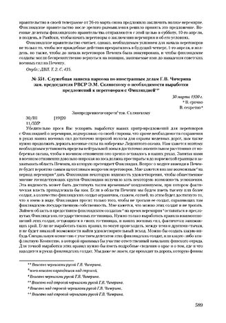 Служебная записка наркома по иностранным делам Г.В. Чичерина зам. председателя РВСР Э.М. Склянскому о необходимости выработки предложений к переговорам с Финляндией. 30 марта 1920 г. // АВП РФ. Ф. 04. Оп. 41. П. 249. Д. 53383. Л. 5-5 об. Машинопись.