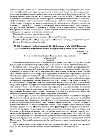 Доклад (служебной запиской № 82) Полевого штаба РВСР Главкому об установлении нейтральной зоны и демаркационной линии с Финляндией. 30 марта 1920 г. // АВП РФ. Ф. 04. Оп. 41. П. 249. Д. 53383. Л. 8-9. Машинопись.