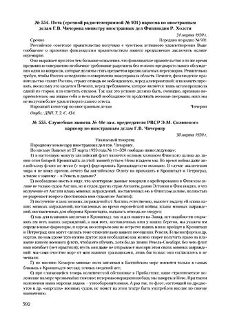 Нота (срочной радиотелеграммой № 931) наркома по иностранным делам Г.В. Чичерина министру иностранных дел Финляндии Р. Холсти. 31 марта 1920 г. // Опубл.: ДВП. Т. 2. С. 434.