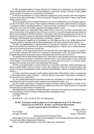 Докладная записка наркома по иностранным делам Г.В. Чичерина председателю СНК В.И. Ленину о требовании Финляндии удалить красные финские войска от границы. 10 апреля 1920 г. // АВП РФ. Ф. 4. Оп. 41. П. 249. Д. 54482. Л. 16. Копия автографа; Л. 17. Копия другого автографа; Л. 15. Машинопись. Опубл.: Россия и Финляндия: от противостояния к миру. 1917-1920 гг. С. 309-310.