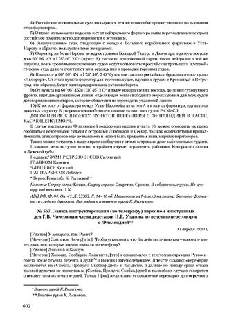 Запись инструктирования (по телеграфу) наркомом иностранных дел Г.В. Чичериным члена делегации П.Г. Удалова по ведению переговоров с Финляндией. 11 апреля 1920 г.