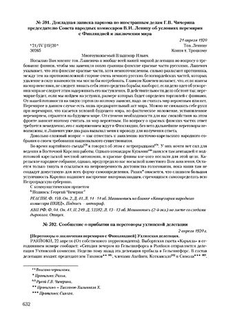 Сообщение о прибытии на переговоры ухтинской делегации. 2 апреля 1920 г.