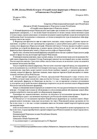 Доклад Штаба Коморси «О корабельных фарватерах в Финском заливе» в Реввоенсовет Республики. 24 апрели 1920 г.