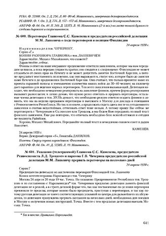 Переговоры Главкома С.С. Каменева и председателя российской делегации М.М. Лашевича о ходе переговоров и позиции Финляндии. 24 апреля 1920 г. // АВП РФ. Ф. 04. Оп. 41. Д. 53383. Л. 19. Машинопись.