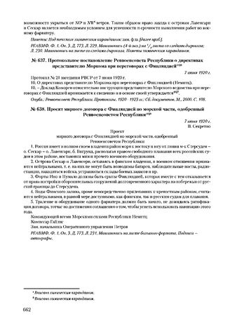 Протокольное постановление Реввоенсовета Республики о директивах представителю Моркома при переговорах с Финляндией. 7 июня 1920 г. // Опубл.: Реввоенсовет Республики. Протоколы. 1920-1923 гг.: Сб. документов. М., 2000. С. 108.